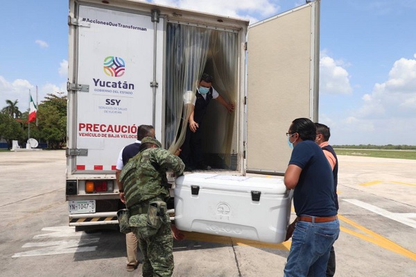 Acompañado del coordinador Estatal para la Vacunación Covid-19, capitán de Corbeta Carlos Gómez Montes de Oca, el funcionario constató la descarga de las vacunas e insumos, a cargo de personal del Ejército, el cual se colocó en un camión thermoking de la SSY, para su traslado al almacén, desde donde se distribuirán para su aplicación.