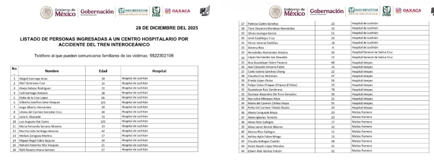 SemMéxico, Oaxaca, 29 de diciembre, 2025.- A más de 24 horas del trágico accidente ferroviario ocurrido la mañana de este domingo en el llamado Tren Interoceánico, las autoridades no han dado a conocer los nombres de las 13 personas fallecidas, entre ellas una menor.