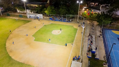 Nuevo campo de sóftbol, con andadores, área de ejercitadores, gradas, estacionamiento para bicicletas, sistema de riego, luminarias y una caja de bateo con malla ciclónica de seis metros de altura. Inversión de 5.2 millones de pesos.