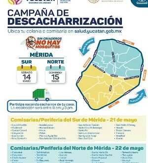 El próximo sábado 14 de mayo, las brigadas trabajarán en las colonias de la zona sur y el domingo 15, tocará al sector norte; en tanto, las comisarías, colonias y fraccionamientos aledañas a la periferia de la capital, se atenderán el sábado 21, para la zona sur y el domingo 22, para la región norte; estas labores de descacharrización se llevarán a cabo en coordinación con el Ayuntamiento de Mérida.