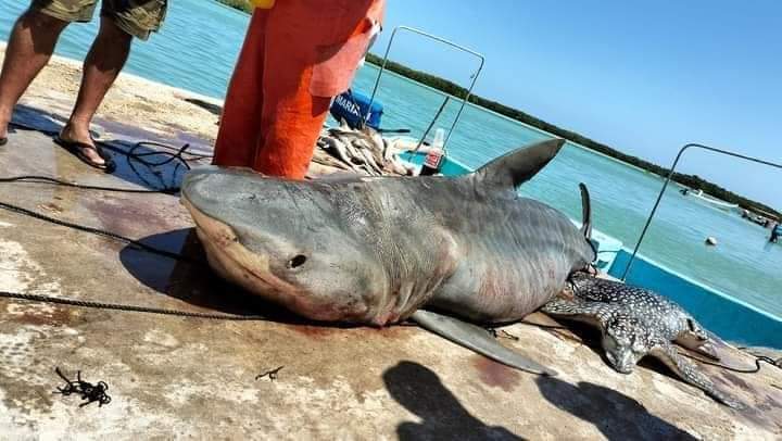 Este sorprendente hallazgo se dio durante una intensa jornada de pesca, cuando don Eduardo Huchim y su tripulación recogían sus redes y descubrieron al inmenso escualo enredado en ellas accidentalmente.