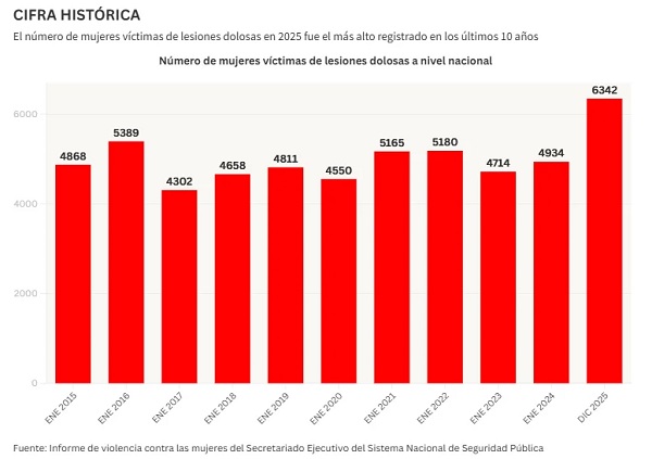 SemMéxico/El Sol de México, Ciudad de México, 30 de enero, 2026.- En 2025 en el país hubo menos feminicidios, pero aumentó el número de mujeres víctimas de lesiones dolosas.