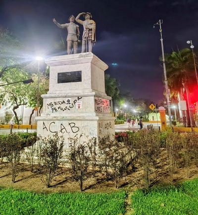 Al llegar al monumento a Justo Sierra O’Reilly, algunos grupos se detuvieron para manifestarse. En el sitio derribaron las vallas de protección colocadas previamente, realizaron pintas e incluso, encendieron fuego como parte de la protesta.