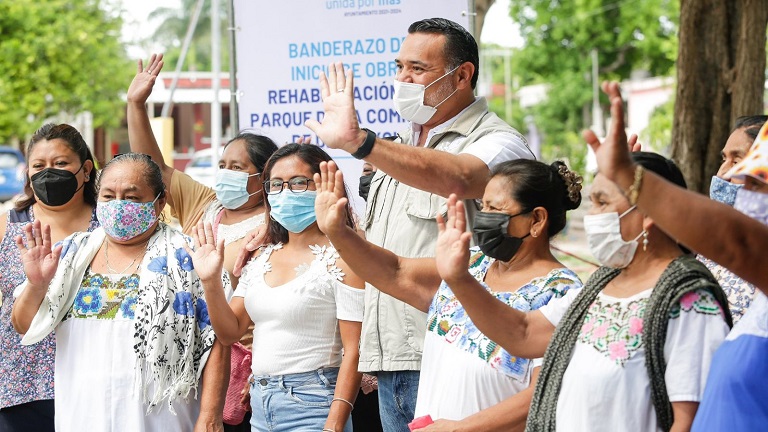 En el banderazo de inicio para la rehabilitación del parque de Dzoyaxché estuvo acompañado por la comisaria Sandra Maribel Tzab Chan y las y los vecinos de la comisaría, a quienes el Presidente Municipal informó que la inversión de infraestructura en el Municipio no está determinada por la concentración de población, sino que el Ayuntamiento cumple con brindar a todas y todos los habitantes las mismas oportunidades de disfrute de espacios públicos dignos.