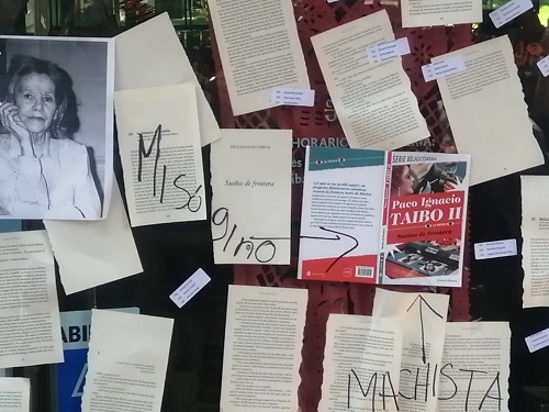 De manera pacífica y creativa, decenas de mujeres pegaron en la fachada de la librería fotos de escritoras mexicanas e iberoamericanas, como Elena Garro, Rosario Castellanos y María Teresa León, entre otras; colocaron tendederos con los nombres de poetisas y escritoras fallecidas y en activo; y deshojaron un libro de Taibo II en protesta por sus dichos, tras calificar un poemario escrito por una mujer como “horriblemente asqueroso de malo”.