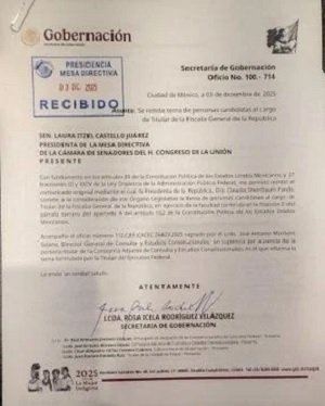 SemMéxico, Cd. de México, 3 de diciembre, 2025.- Esta tarde el Senado acordará entre tres mujeres quién será la Fiscal de la República, luego de recibir la terna de la presidenta Claudia Sheinbaum Pardo, lo hará hoy mismo el pleno.