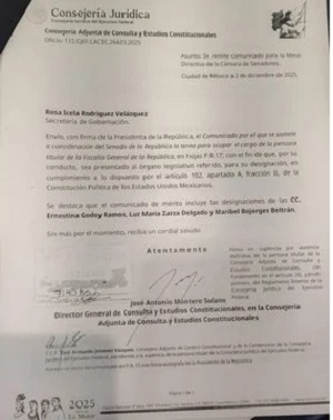 Escribió: Nos han hecho llegar por parte de la presidenta @Claudiashein el oficio mediante el cual nos remite las tres candidatas a ocupar la Fiscalía General de la República, integrada por: Ernestina Godoy Ramos, Luz María Zarza Delgado Maribel Bojorges Beltrán