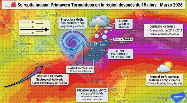 Generalmente marzo, es el mes más seco del año en nuestra región de manera natural, y por ende es cuando comienzan a manifestarse extensos y duraderos sistemas anticiclónicos que propician tiempo caluroso y estable. No obstante, de acuerdo con información del Centro Hidrometeorológico Regional Mérida de CONAGUA, las lluvias de este marzo 2026, casi triplican en el promedio de lluvia del mes en los estados de Campeche y Quintana Roo, mientras que en el estado de Yucatán prácticamente se duplicó el promedio de lluvia mensual.
