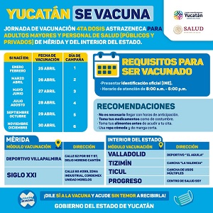 - -Esta etapa de vacunación se desarrollará del lunes 25 al sábado 29 de abril en los municipios de Mérida, Valladolid, Tizimín, Ticul y Progreso.