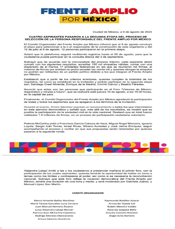 La primera fase del proceso de selección del próximo candidato o candidata presidencial del Frente Amplio por México concluyó el martes 8 de agosto; el Comité Técnico anunció los cuatro aspirantes que lograron reunir más de 150 mil firmas de respaldo de ciudadanos en todo el país y que avanzaron a la siguiente etapa.