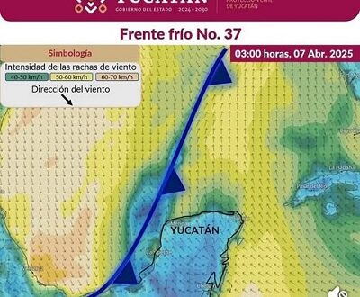 Mérida, 7 de abril, 2025.- Este lunes, se prevé el ingreso del frente frío No. 37 entre las 13:00 horas y las 15:00 horas por el noroeste de Yucatán. El sistema recorrerá gradualmente el estado, provocando lluvias, evento de norte y actividad eléctrica. También se esperan rachas de viento y aumento en el oleaje.