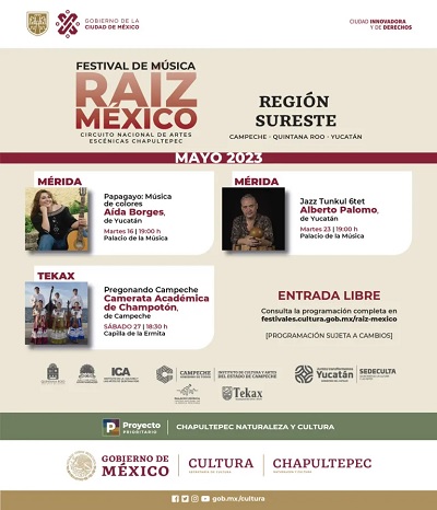 Como parte del Festival de Música “Raíz México” 2023, artistas de Campeche, Quintana Roo y Yucatán participarán en una gira por esta última entidad, del 7 de mayo al 24 de junio, en cumplimento a la estrategia del Gobernador Mauricio Vila Dosal, de impulsar a creadoras y creadores de arte y promotores de cultura.