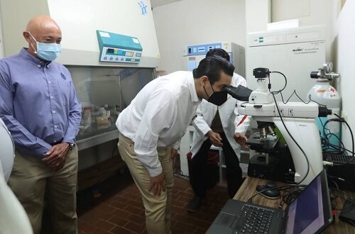 En representación de Vila Dosal, el titular de la Secretaría de Investigación, Innovación y Educación Superior (Siies), Mauricio Cámara Leal, constató el funcionamiento de los equipos que permitirán a los académicos reforzar el trabajo de investigación de enfermedades relacionadas con el mal de Chagas, la tuberculosis, toxoplasmosis, rickettsia y Covid.