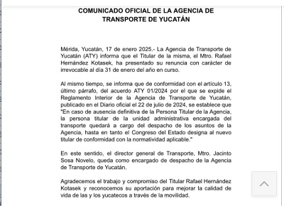 El Gobierno del Estado de Yucatán informa que, tras haberse hecho pública la renuncia con carácter de irrevocable del titular la Agencia de Transporte de Yucatán (ATY) y de acuerdo con lo que dispone el artículo 75 sexies, el Gobernador del Estado estará atento a la notificación del Congreso del Estado de Yucatán, para someter a consideración del Poder Legislativo una terna de personas aspirantes a ocupar el cargo de Titular de la Agencia de Transporte de Yucatán.