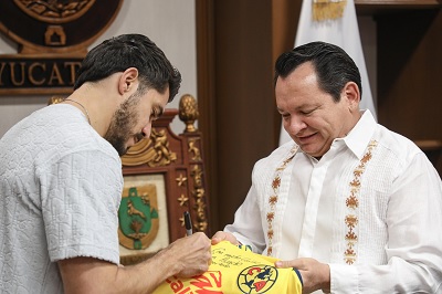 El mandatario estatal recibió al delantero americanista en su despacho, en Palacio de Gobierno, para platicar sobre su gran desempeño en la más reciente temporada con el equipo azulcrema, así como sobre el gran modelo a seguir en el que se ha convertido para las yucatecas y los yucatecos de todas las edades.
