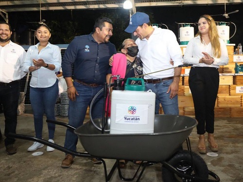 Junto con el titular de la Secretaría de Desarrollo Rural (Seder), Jorge Díaz Loeza, Vila Dosal realizó la entrega de una carretilla y una bomba aspersora a la productora María Brito Chan, quien agradeció el decidido apoyo del Gobernador hacia este sector, pues es un importante impulso a sus tierras para poder producir más y mejorar su economía familiar. En esta localidad se entregaron productos como tinacos con capacidad de 450 litros, azúcar para alimentar abejas, cajas apícolas, paneles solares, triciclos reforzados con llantas anchas, motosierras, entre otros.