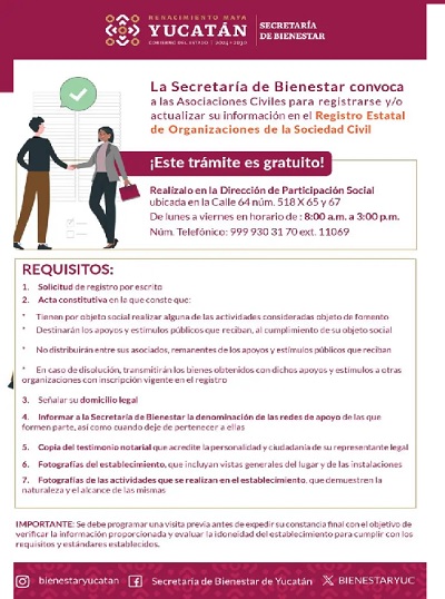 El Gobierno del Estado de Yucatán, encabezado por Joaquín Díaz Mena, a través de la Secretaría de Bienestar, ha abierto el proceso de registro y actualización de información en el Registro Estatal de Organizaciones de la Sociedad Civil. Este trámite es gratuito y busca fortalecer la relación entre el gobierno y las asociaciones civiles que trabajan en beneficio de la comunidad.