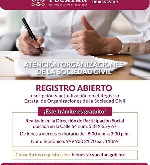 El registro se realiza en la Dirección de Participación Social, ubicada en Calle 64 #518, entre 65 y 67, Centro, Mérida, en un horario de lunes a viernes de 8:00 a.m. a 3:00 p.m. Para más información, las organizaciones pueden comunicarse al teléfono 999 930 31 70, extensión 11069.