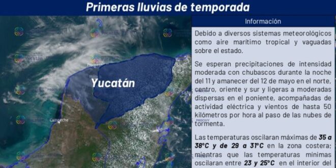 La Coordinación Estatal de Protección Civil (Procivy) anticipó para este jueves 11 y viernes 12 de mayo las primeras precipitaciones de la temporada de lluvias ante la aproximación de aire marítimo tropical y vaguadas al estado de Yucatán.