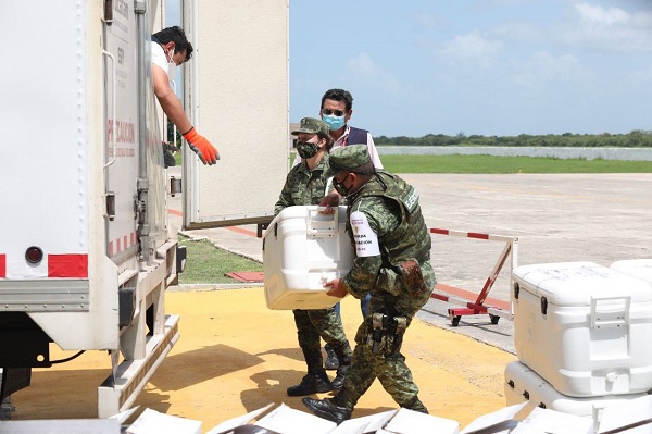 Por instrucciones de Vila Dosal, el subdirector de Salud Pública de la Secretaría de Salud del estado (SSY), Carlos Isaac Hernández Fuentes, acudió a la Base Aérea Militar Número 8 para supervisar el arribo de  las vacunas, las cuales llegaron a las 2:30 de esta tarde a bordo de una aeronave Boeing 737 matrícula 3528 de las Fuerzas Armadas, proveniente de la Ciudad de México.