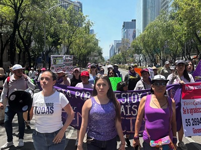 Ahí se reunieron dos manifestaciones de forma simultánea, una encabezada por la alcaldesa de la Cuauhtémoc, Alessandra Rojo de la Vega, y otra por sociedad civil variopinta, ataviadas de blanco y lila o morado y muchas colectivos feministas.