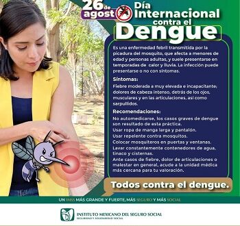En el marco del día Internacional contra el Dengue, el Instituto Mexicano del Seguro Social (IMSS) en Yucatán orienta sobre signos y síntomas de esta enfermedad viral, que se transmite por la picadura del mosco Aedes Aegypti, con el objetivo de reforzar y fortalecer la salud de todas y todos y así evitar cualquier complicación.