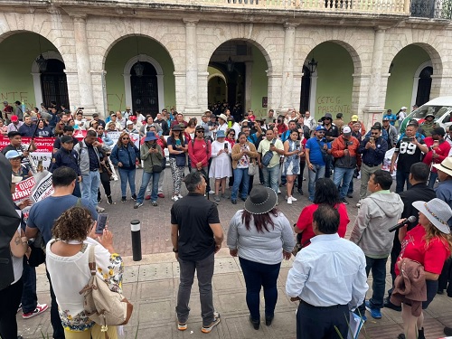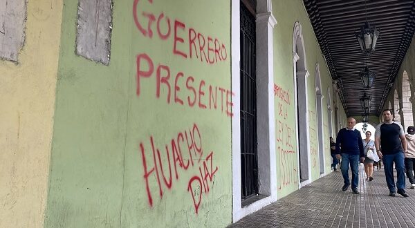 Mérida, 31 de enero de 2026.- Poco menos de 200 agremiados a la Coordinadora Nacional de Trabajadores de la Educación (CNTE), algunos de ellos con piedras en las manos, protagonizaron una marcha del Monumento a la Patria hacia Palacio de Gobierno, donde realizaron pintas en inmuebles públicos y privados.