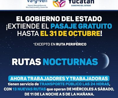 Mérida, Yucatán, 26 de septiembre de 2022.- En respaldo a la economía de las familias yucatecas, el Gobernador Mauricio Vila Dosal dispuso que el servicio de Rutas Nocturnas del sistema de transporte “Va y ven” continúe siendo gratuito durante todo el próximo mes de octubre.