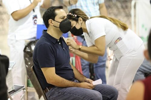 -Junto con demás ciudadanos, pasó por las áreas de recepción de documentos, aplicación de la dosis y observación, en el macrocentro instalado en el Centro de Convenciones “Yucatán Siglo XXI”.
