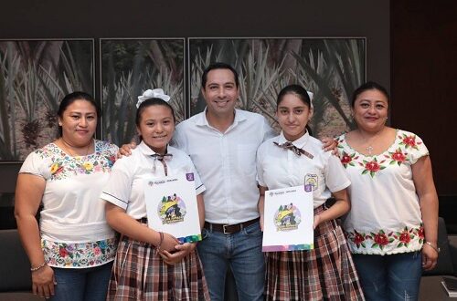 Vila Dosal recibió a las originarias de Oxkutzcab, egresadas de la escuela primaria “Valentín Gómez Farías”, y les reiteró su respaldo para continuar poniendo en alto los nombres de Yucatán y México en el extranjero, con “Ciencia Maya. Los hallazgos sorprendentes del castillo de Chichén Itzá”, prototipo que, con una maqueta, demuestra el descenso de Kukulcán, la Serpiente Emplumada, desde la cosmovisión maya.