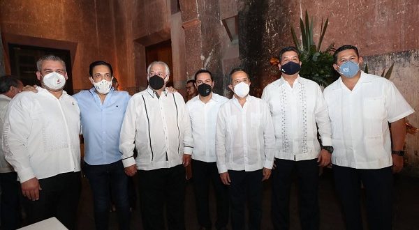 Mérida, Yucatán, 15 de noviembre de 2021.- El Gobernador Mauricio Vila Dosal recibió esta noche a los gobernadores de Quintana Roo, Carlos Joaquín González; Tamaulipas, Francisco Javier García Cabeza de Vaca; Guanajuato, Diego Sinhué Rodríguez Vallejo; Hidalgo, Omar Fayad Meneses; y Michoacán, Alfredo Ramírez Bedolla, quienes ya se encuentran en Yucatán para participar en el Tianguis Turístico, que iniciará mañana martes.