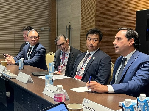 Junto a los presidentes de la Asociación de Maquiladoras de Exportación de Yucatán (Index), Alejandro Guerrero Lozano; de la Cámara Nacional de la Industria del Vestido de Yucatán (Canaive), Jorge Moreno González; de la Cámara Nacional de la Industria de Transformación (Canacintra); Arturo Peniche Solís, de la empresa yucateca Arpen SPR; Víctor Juan Zacarías Solís y Feud Zacarías Solís, de la Cámara Nacional de la Industria Pesquera (Canainpesca), el Gobernador presentó las ventajas competitivas logísticas del estado, la certeza jurídica y mano de obra calificada que hacen de Yucatán el estado idóneo para la inversión.