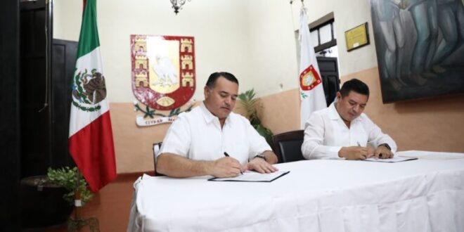 Valladolid, Yucatán; 1 de abril de 2023.- Para seguir fortaleciendo a los municipios y crear una sinergia que beneficie a todas y todos los yucatecos, el alcalde de Mérida Renán Barrera Concha y el alcalde de Valladolid Alfredo Fernández Arceo refrendaron la firma del convenio de promoción de arte y cultura entre Mérida y Valladolid.