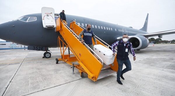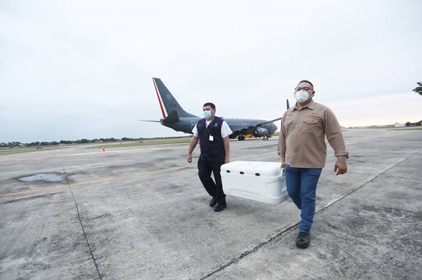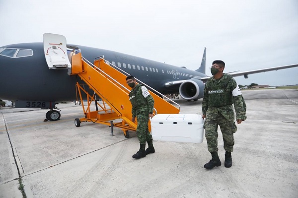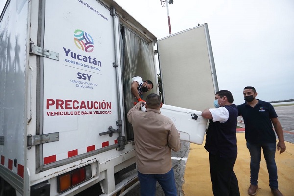 Por instrucciones del Gobernador Mauricio Vila Dosal, el director de Prevención y Protección de la Salud de la SSY, Isaac Hernández Fuentes, acudió a la Base Aérea Militar (BAM) número 8, para supervisar el arribo de este nuevo lote, a bordo de una aeronave Boeing 737-800 de la Fuerza Aérea Mexicana, matrícula 3526, proveniente de la Ciudad de México, que tocó territorio estatal a las 5:04 de esta tarde.