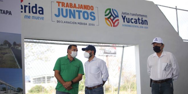 En el fraccionamiento Chenkú, Vila Dosal y Barrera Concha visitaron esta obra que se encuentra contemplada dentro del proyecto de Paseo Henequenes y viene a ofrecer un nuevo espacio para que los habitantes de esta zona de la ciudad realicen actividades deportivas, culturales y de recreación.