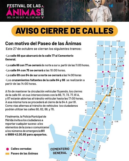 Asimismo, la SSP y la Policía Municipal desplegarán un operativo vial este 27 de octubre, que abarcará del Cementerio General sobre la calle 66 hasta la calle 77, en la zona de La Ermita de Santa Isabel, por tanto, se invita a las y los conductores a tomar sus precauciones o tomar rutas alternas ya que se efectuarán los siguientes cierres: