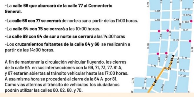 A las 10:00 horas se cerrará al tránsito vehicular en el cruce de la calle 64 por 75; a las 11: horas la calle 66 en su cruce con la 77 estará cerrada a la circulación de norte a sur; a las 14:00 horas, la calle 69 por 64 estará cerrada.
