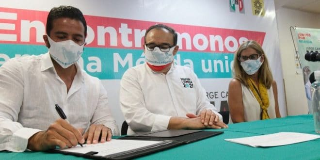 Mérida, Yucatán; 1 de junio de 2021.- El candidato a la alcaldía de Mérida, Jorge Carlos Ramírez Marín, firmó el convenio “El Cáncer en la Agenda”, para promover acciones desde el gobierno municipal para reforzar el sistema de salud que coadyuve en la detección, atención, seguimiento e investigación sobre este padecimiento.