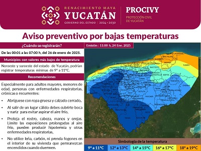 El Gobierno del Estado, a través de la Coordinación Estatal de Protección Civil (Procivy), informa que, debido a la masa de aire ártico que impulsó al Frente Frío No. 24, se espera que en la madrugada de este domingo 26 de enero se registre un descenso en las temperaturas en todo el Estado de Yucatán, por lo que se recomienda a la población tomar las debidas precauciones.