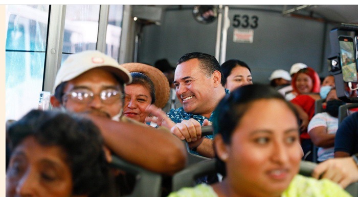 Acompañado de sus hijos Renán y Daniela, el Presidente Municipal abordó el camión en el paradero ubicado en la calle 28 con Circuito Colonias donde saludó a las y los usuarios que junto con él se trasladaron hacia las instalaciones de Ciudad Carnaval.