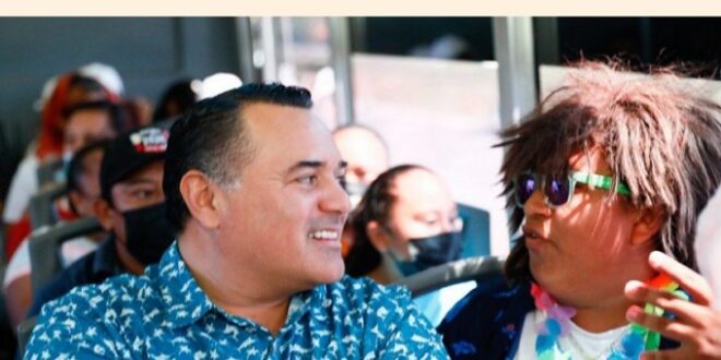 Acompañado de sus hijos Renán y Daniela, el Presidente Municipal abordó el camión en el paradero ubicado en la calle 28 con Circuito Colonias donde saludó a las y los usuarios que junto con él se trasladaron hacia las instalaciones de Ciudad Carnaval.