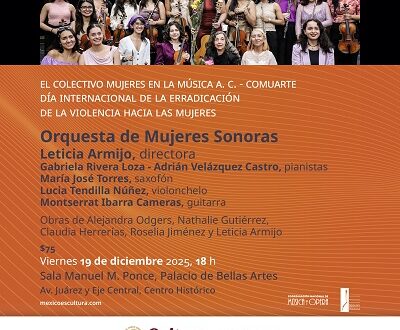 SemMéxico, Ciudad de México, 17 de diciembre, 2025.- En el marco del Día Internacional de la Erradicación de la Violencia hacia las Mujeres, con un programa que reúne estrenos y obras contemporáneas que celebran la fuerza creativa de las compositoras mexicanas, la Orquesta de Mujeres Sonoras dirigida por Leticia Armijo, perteneciente al Colectivo Mujeres en la Música A. C. – ComuArte, ofrecerá un concierto que une arte, identidad y resistencia el viernes 19 de diciembre, a las 18 horas, en la Sala Manuel M. Ponce del Palacio de Bellas Artes.