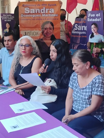 Sandra Domínguez Martínez desapareció en la población de María Lombardo de Caso Oaxaca el 4 de octubre de 2024, su madre y sus hermanas nunca dejaron de luchar porque apareciera acompañada de diversas organizaciones. Destacan los pronunciamientos internacionales de organismo afines a la ONU y de organizaciones naciones e internacionales de defensoras.