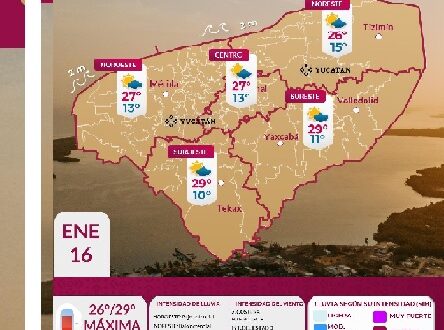 Para este viernes, la masa de aire polar asociada al sistema frontal mantiene un ambiente muy frío en Yucatán. Las temperaturas mínimas se ubicarán entre 10 grados y 11 grados en municipios del centro y sur del estado. En tanto, en el noreste y noroeste, los valores oscilarán entre 13 grados y 15 grados.