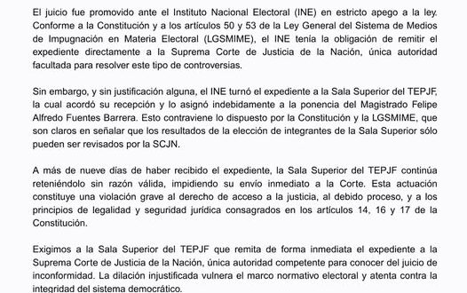 Tras más de nueve días, la Sala Superior del TEPJF continúa reteniendo el expediente sin razón válida, impidiendo su envío inmediato a la Suprema Corte. Esto constituye una violación grave al derecho de acceso a la justicia, al debido proceso, y a los principios de legalidad y seguridad jurídica. Se exige al TEPJF que remita de inmediato el expediente a la Suprema Corte, la única autoridad competente para conocer del juicio de inconformidad.