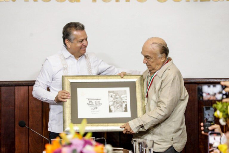 En reconocimiento al maestro Tomás Ceballos Campos por sus 60 años de experiencia en la escena teatral, el Alcalde Alejandro Ruz Castro le entregó la medalla Héctor Herrera “Cholo” 2024, presea con la que se distingue a mujeres y hombres que con sus obras, trayectoria y aportaciones, enaltecen al teatro regional yucateco.