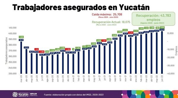 Hay que recordar que, por efecto de la pandemia, en tan solo cuatro meses se perdieron 25 mil 708 plazas laborales, sin embargo, fruto de la promoción realizada por el Gobernador Vila Dosal para atraer inversiones a Yucatán, así como la enérgica estrategia de reactivación económica, se han creado 42,000 nuevas plazas, superando por más de 16,000 la cifra de pérdidas.