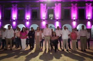 •El alcalde de Progreso, Erik José Rihani González, participa en la iluminación rosa del Palacio …