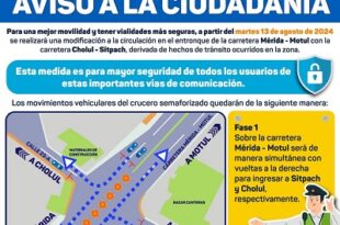 Leer Mas ...A partir del próximo martes 13 de agosto, habrá modificaciones a la movilidad vial en el entronque de la carretera Mérida – Motul