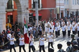 Junto con los yucatecos, Vila Dosal observó los diversos contingentes que participaron en el desfile, …